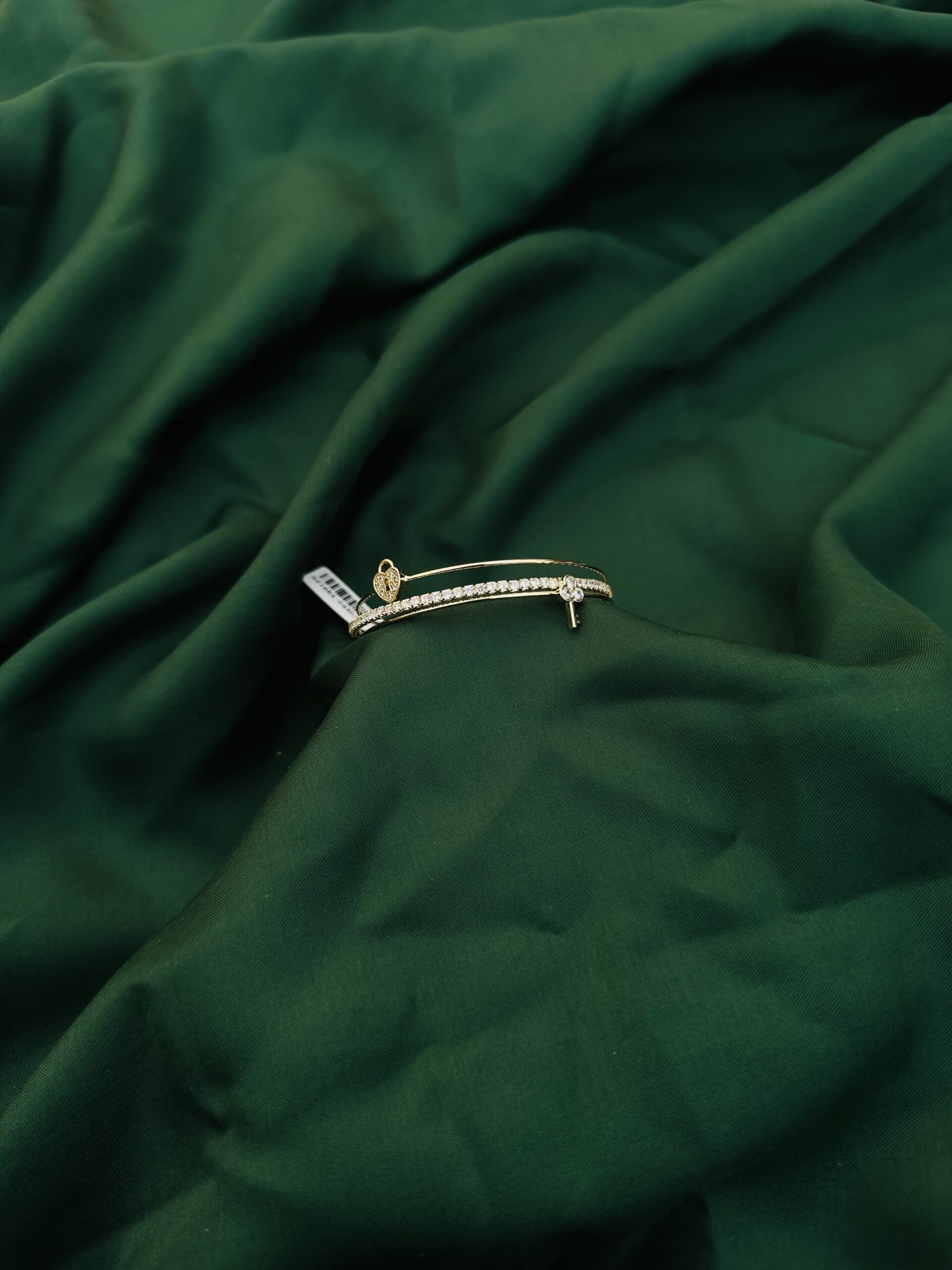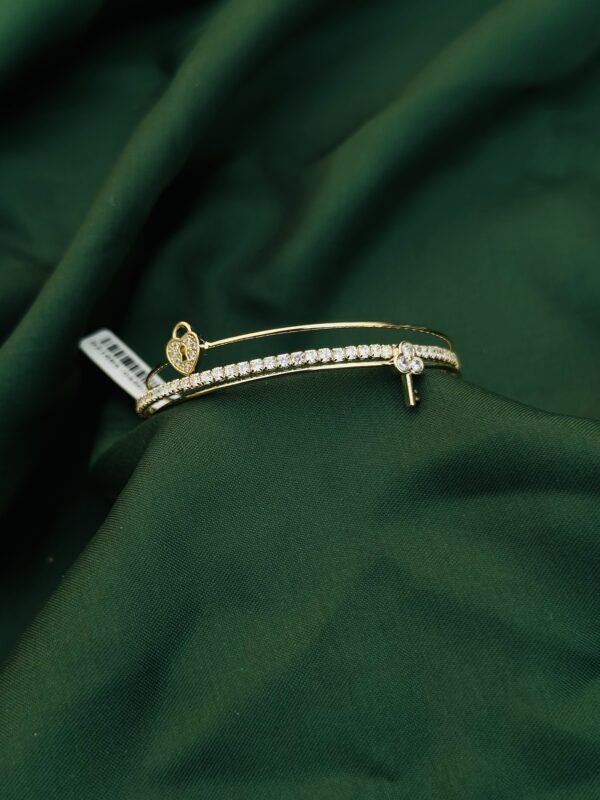 This elegant bracelet features a sleek gold finish with two captivating charms—a heart and a key—symbolizing love and trust. The band is adorned with a row of sparkling crystals, adding a luxurious touch to its minimalistic design. The heart charm is intricately detailed, while the key offers a playful yet meaningful accent.