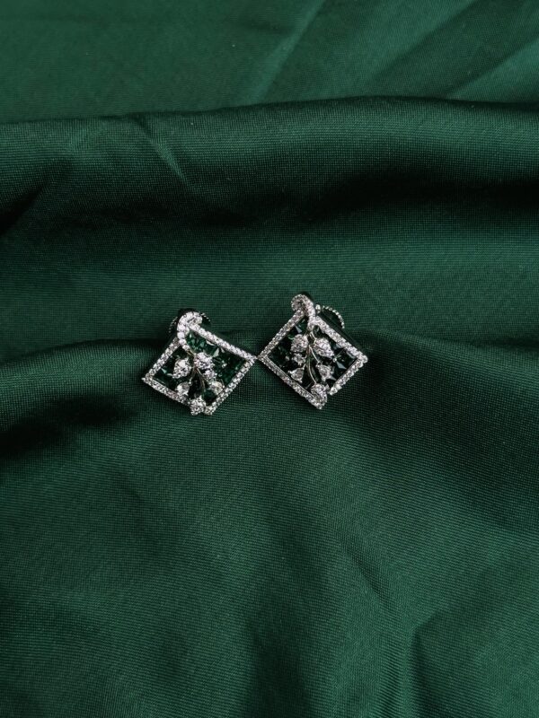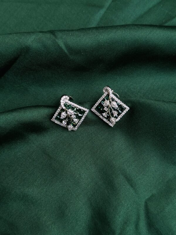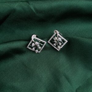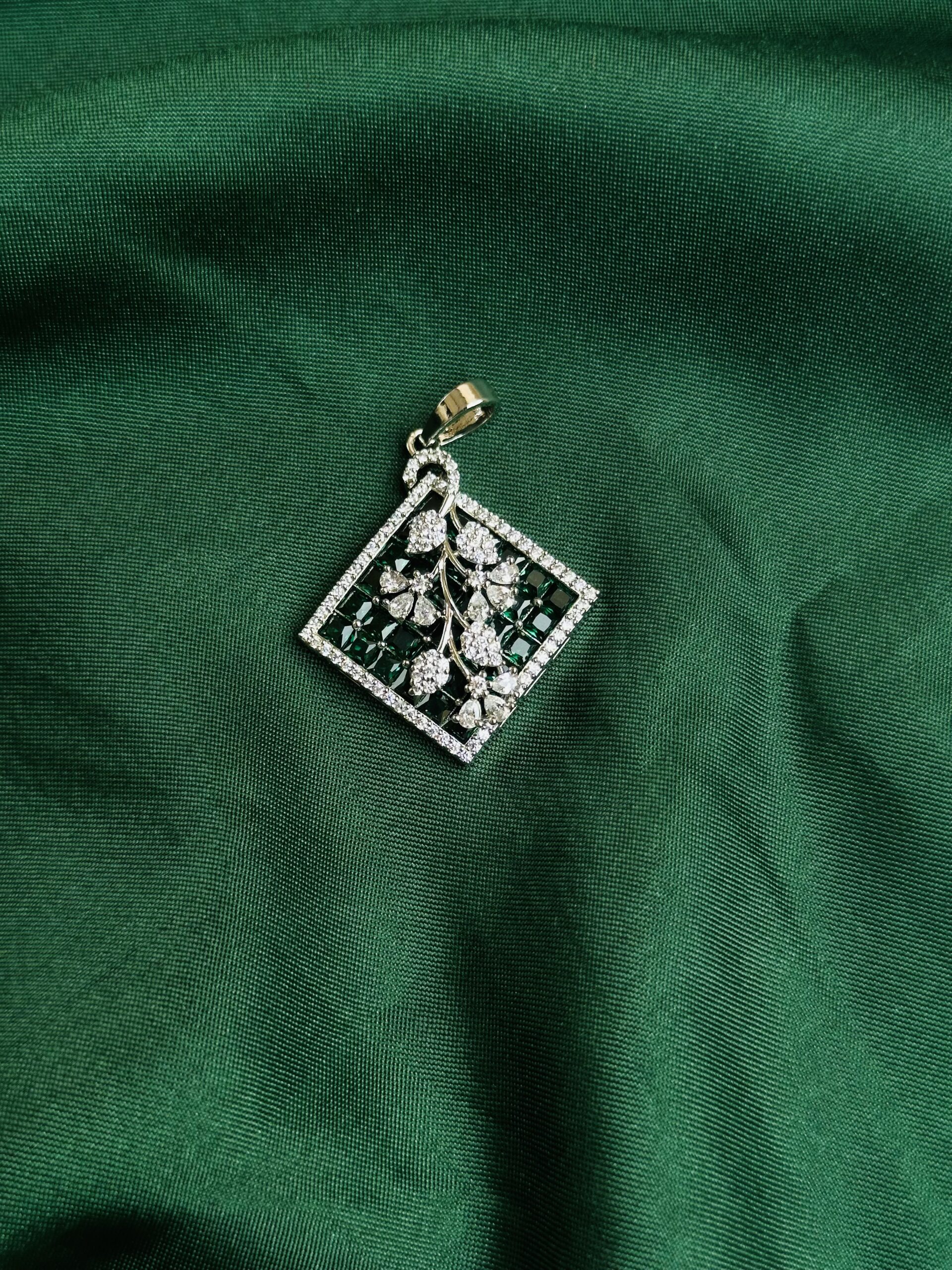 This Nature’s Nymph AD Pendant showcases a stunning and intricate pendent. The thingt is diamond-shaped and features a beautiful floral design with green gemstones, possibly emeralds or emerald-colored stones, set within a frame of smaller, white stones, likely diamonds or cubic zirconia. The contrast between the green and white stones creates a visually striking and elegant piece.