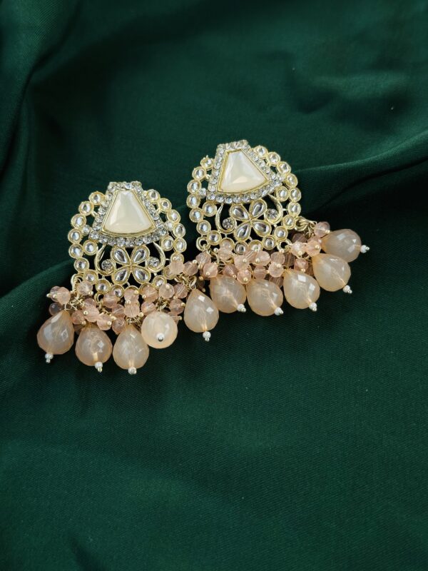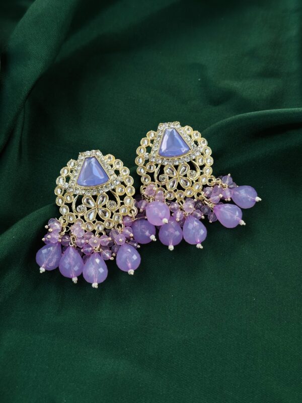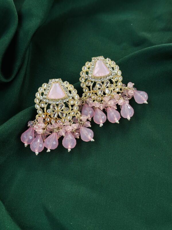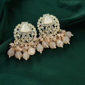 Elevate your style with these exquisite Polki earring, crafted to perfection with a mesmerizing blend of delicate floral motifs and teardrop embellishments. The centerpiece features a triangular Polki stone surrounded by intricate kundan detailing, radiating elegance and charm. Suspended from the floral design are cascading bead drops in pastel hues, adding a splash of color and a dynamic touch to your look.